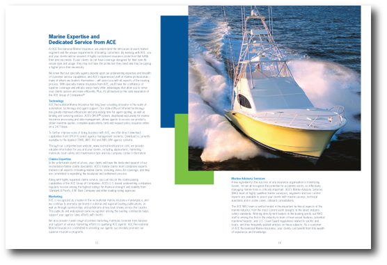 ACE Recreational Marine Insurance, a division of ACE USA, offers recreational marine insurance products. We have built a strong brand for ACE Recreational Marine creating everything from ads and fact sheets to complete capabilities packages. The pocket of their capabilities brochure holds individual fact sheets providing details about specific products that can easily be updated without reprinting the entire brochure.